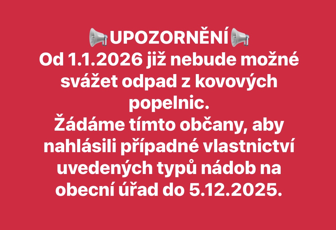 Od 1. 1. 2026 již nebude možné svážet odpad z kovových popelnic. Žádáme tímto občany, aby nahlásili případné vlastnictví uvedených nádob na obecní úřad do 5. 12. 2025.